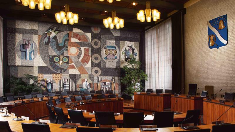 Het stadhuis is een typisch voorbeeld van de Delftse school, aangevuld met Italiaanse en Scandinavische invloeden. Achter de vijf grote vensters liggen de burgerzaal en de raadzaal. Naast het meest rechtse venster is het gemeentewapen uitgevoerd in een natuurstenen reliëf.
